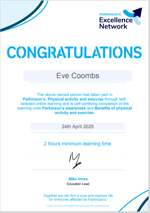 Evie is trained through Parkinson’s UK, having completed their Parkinson’s Awareness and Benefits of Physical Activity and Exercise course. She also works closely with the Cirencester and Stroud Parkinson’s group, ensuring her approach is grounded in the latest support and care strategies.